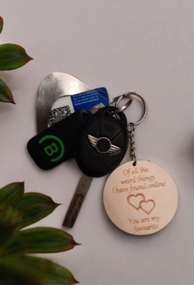 Our cute couple keyrings are a fun way to let your other half know you love them. Made from 4mm birch plywood these are engraved with the saying "Of all the weird things I have found online, you are my favourite" each keyring measures 55cm