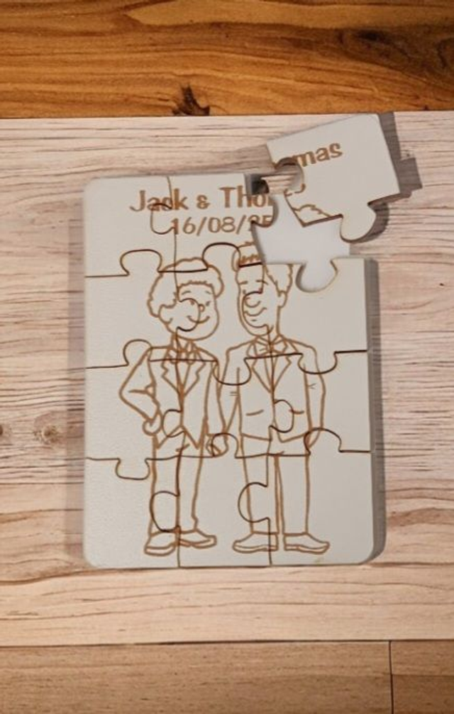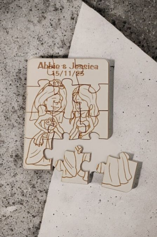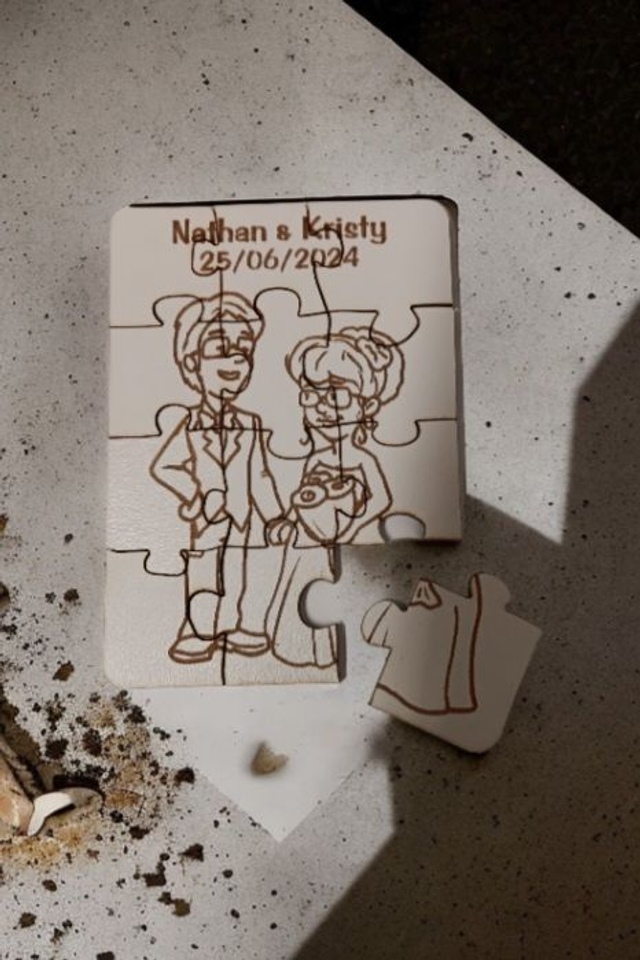 Our new couple jigsaw favour is a fun way to keep your guests entertained at the table, once completed they can be coloured in with felt tips or left plain. Features a personalised board with your choice of couple and comes in an organza bag of your choice.